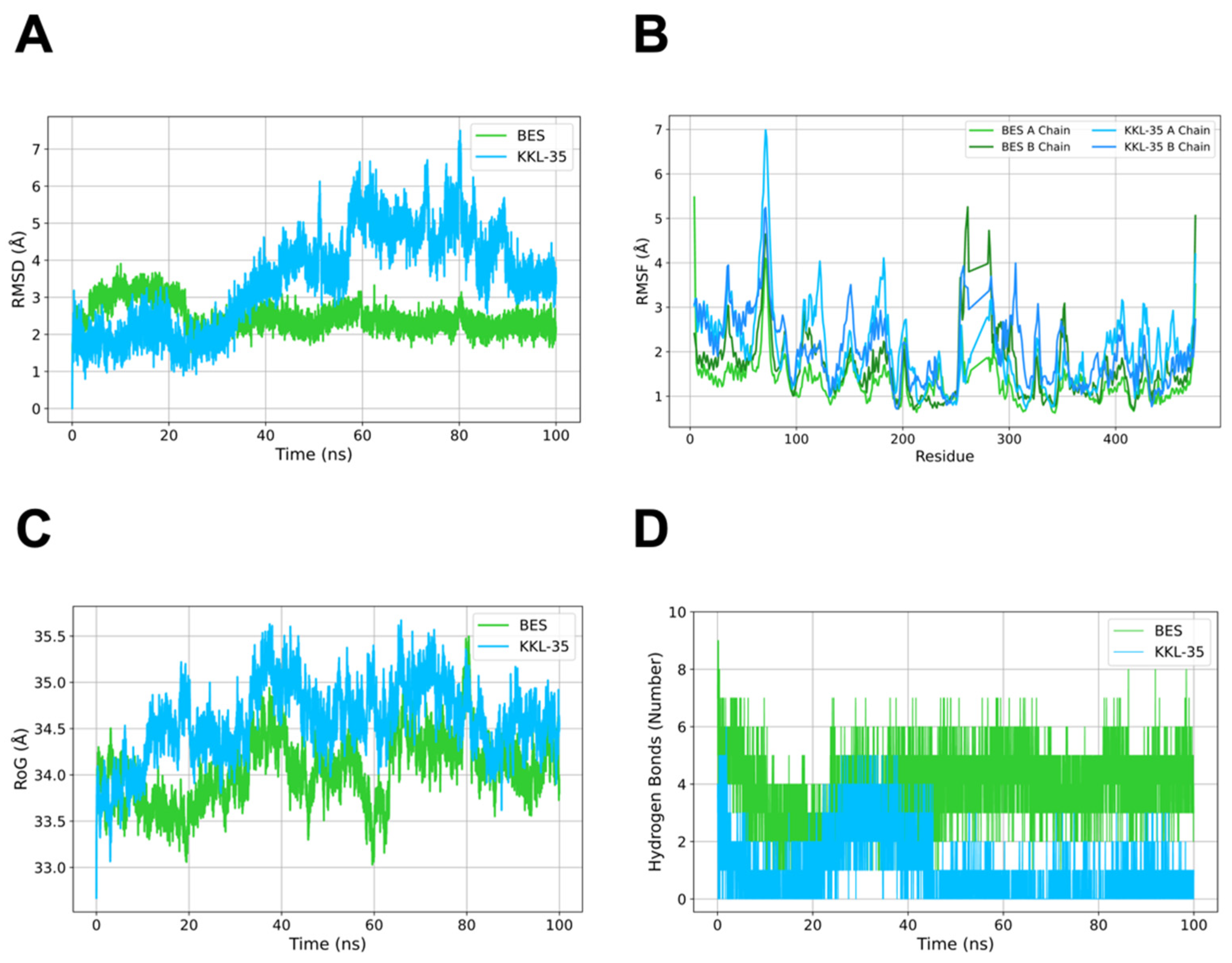 RMSD analysis revealed that the protein–ligand complex remained stable throughout the simulation, with values consistently within the 2–3 Å range, which is generally indicative of structural stability in MD studies [25,26]. RMSD analysis indicated that the CNDP2–BES complex was stabilized rapidly and maintained low deviations (~3 Å), whereas the CNDP2–KKL35 complex exhibited larger fluctuations (~6–7 Å) after 40 ns (Figure 5A). The fluctuations indicate that the binding mode of CNDP2-KKL35 changes after 40 ns. RMSF analysis reveals the flexibility of each residue during an MD simulation by quantifying its average positional fluctuations over time [27]. RMSF analysis for a protein–ligand complex provides insights into conformational stability and the local flexibility of the binding-site residues following ligand interaction. RMSF profiles for the CNDP2–ligand complexes revealed less flexibility in the overall structure, including catalytic loop regions, in the presence of KKL-35 compared with BES (Figure 5B). The radius of gyration (RoG) measures the overall compactness of the protein structure during an MD simulation, and in a protein–ligand complex, it reflects global conformational stability and potential structural changes upon ligand binding [28]. The RoG for the CNDP2–ligand complexes remained compact and steady in the BES system, whereas KKL-35 binding resulted in minor structural looseness (Figure 5C). Hydrogen bond analysis monitors the number and stability of hydrogen bonds formed during the MD simulation, thus providing insights into key intermolecular interactions that contribute to binding stability [29]. Hydrogen bond analysis confirmed that in the CNDP2–ligand complexes, BES consistently maintained approximately six hydrogen bonds throughout its trajectory, whereas the KKL-35 interactions were fewer and more transient (Figure 5D). Taken together, these results suggest that BES forms a more stable and persistent inhibitory complex with CNDP2 compared with KKL-35.