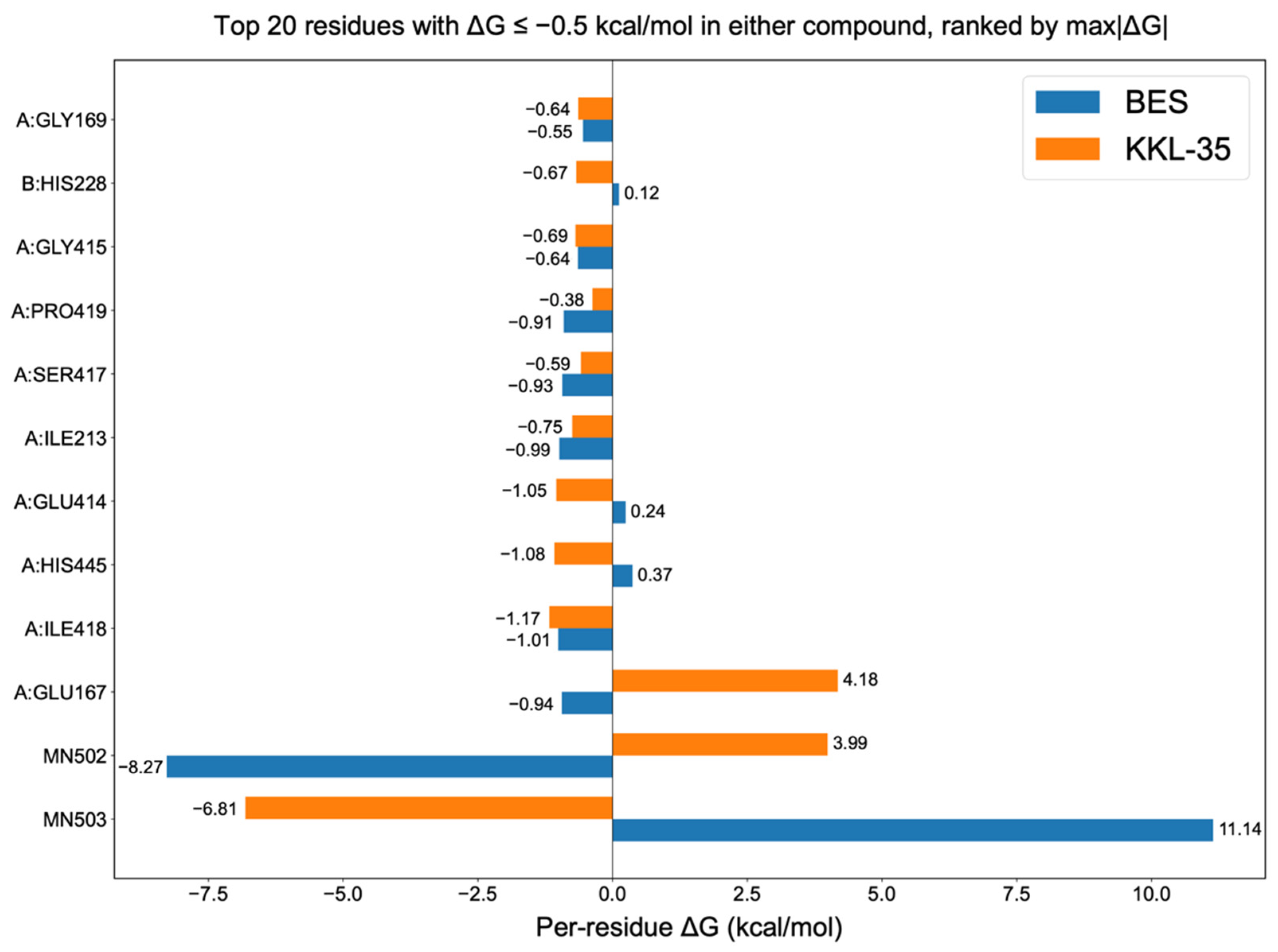 Decomposition of the MM-PBSA terms indicated that van der Waals and electrostatic interactions favor complex formation for both ligands, whereas the polar solvation energy opposes binding, with the nonpolar solvation term providing a modest favorable contribution [32]. The residue-level energy decomposition (Figure 6) revealed a set of shared stabilizing contacts (ΔG ≤ –0.5 kcal mol−1), including GLY169, GLY415, SER417, ILE213, and ILE418 in chain A. In contrast, KKL-35 exhibited unfavorable contributions from GLU167 in chain A (+4.18 kcal mol−1) and small penalties at GLU414 (+0.24 kcal mol−1) and HIS445 (+0.37 kcal mol−1) in chain A. Notably, the two catalytic Mn2+ ions did not uniformly stabilize the complexes. For BES, Mn502 was strongly unfavorable (+11.14 kcal mol−1), whereas Mn503 was stabilizing (–6.81 kcal mol−1). The pattern was reversed for KKL-35, in which Mn502 was stabilizing (–8.27 kcal mol−1) and Mn503 was destabilizing (+3.99 kcal mol−1). These opposing signs indicate distinct metal-coordination/solvation environments for the two ligands, rather than a generic metal-assisted stabilization. Taken together, BES achieved a more favorable ΔG_bind by combining stronger electrostatics with the favorable engagement of one Mn site, whereas KKL-35 suffers from penalties at GLU167 and at one of the Mn centers, which is consistent with its overall weaker affinity.
