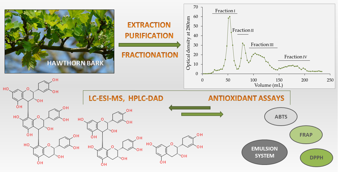 The antioxidant activity of hawthorn bark extract and its fractions was dependent on the assay used, but in general, procyanidin oligomers guaranteed higher antioxidant activity of fractions II–IV compared to fraction I, which contained mainly low-molecular-weight phenolics, including (−)-epicatechin and other flavonoids. Differences in antioxidant activity between fractions containing procyanidin dimers, trimers, and tetramers were insignificant or minor. Nevertheless, PCA revealed an association between procyanidins with the highest degree of polymerization (trimers and tetramers) and antioxidant activity measured under lipophilic conditions of β-carotene-linoleic acid emulsion oxidation.