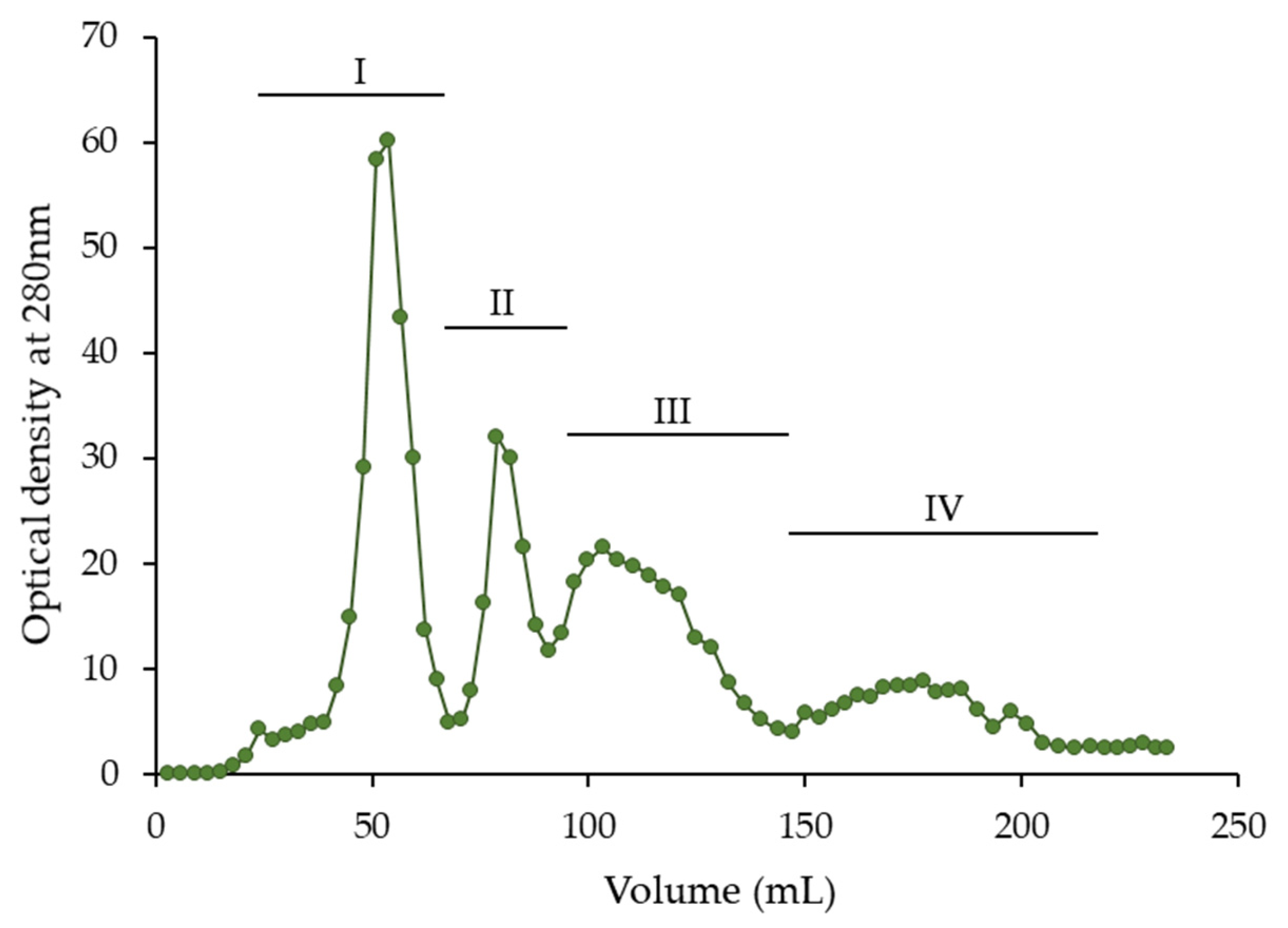 Aqueous acetone (50–80%, v/v) is commonly used to extract plant materials high in proanthocyanidins [18,28,41] and is more effective than other aqueous organic solvents including aqueous ethanol or pure acetone and water [37]. In our study, the bark of young hawthorn twigs was extracted with 80% (v/v) acetone, and the crude extract was purified from ballast compounds, as proposed in previous studies [16,21,44], to concentrate phenolics and obtain an extract rich in flavan-3-ols and their oligomers. Next, the purified extract was separated by low-pressure liquid chromatography on a Toyopearl HW-40S column to obtain fractions containing various types of phenolic compounds. The chromatogram of this separation, with absorbance monitoring at 280 nm, is shown in Figure 1. Four peaks are visible in the chromatogram (I–IV). The eluent corresponding to each peak was fractionated. After evaporation of the methanol, dried fractions I–IV were obtained, the mass of which constituted 10.3–24.6% of the mass of purified extract (Table 1).