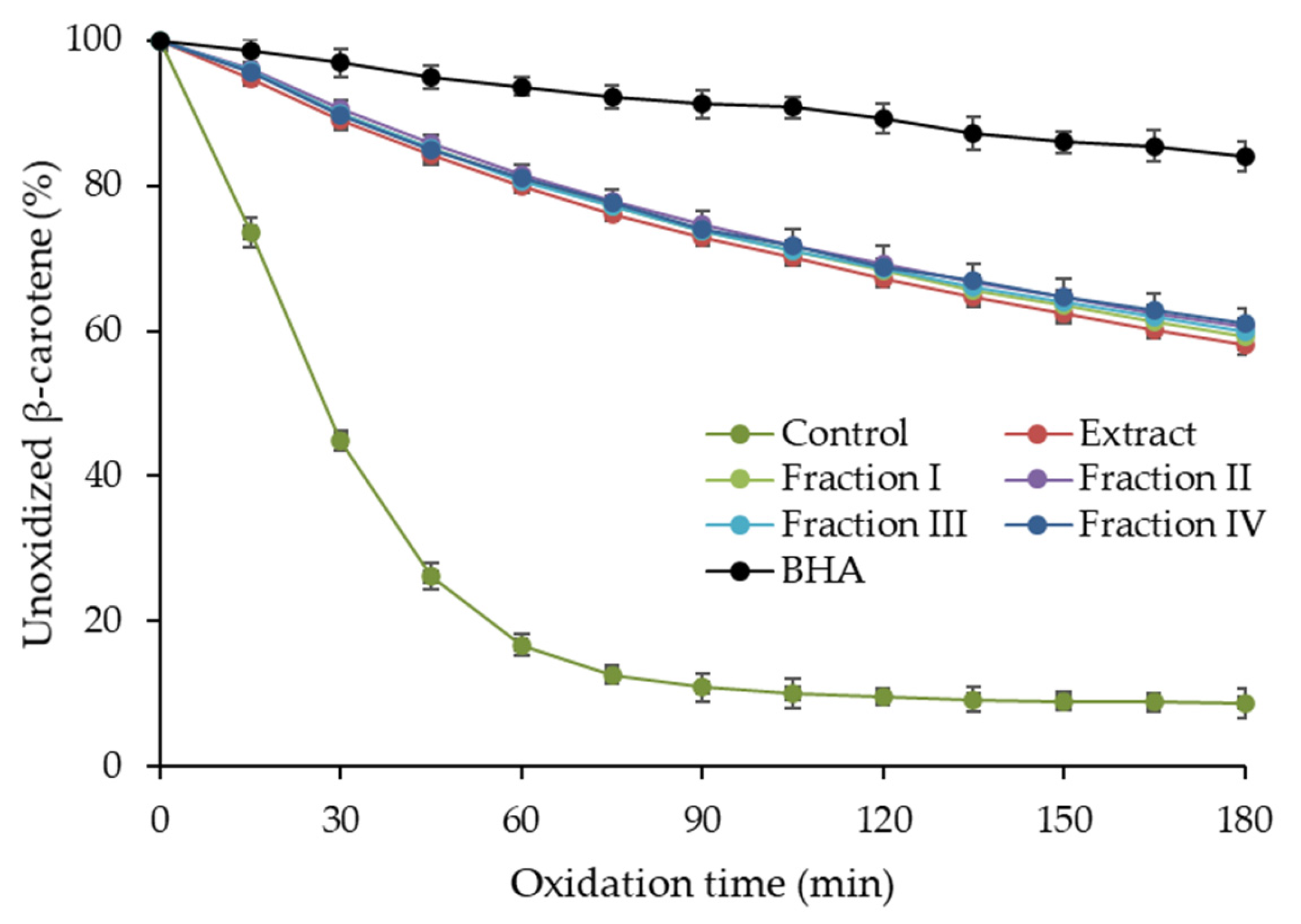 Due to the diverse mechanism of action of phenolic compounds as antioxidants, several assays were carried out to investigate the antioxidant activity of purified hawthorn bark extract and its fractions. Antiradical activity against the 2,2′-azino-bis(3-ethylbenzothiazoline-6-sulfonic acid) radical cation (ABTS•+) and the 2,2-diphenyl-1-picrylhydrazyl radical (DPPH•), as well as ferric-reducing antioxidant power (FRAP) were examined. The results of these assays are presented in Table 4. Furthermore, the ability of the extract and fractions to the inhibit oxidation of the β-carotene-linoleic acid emulsion was analyzed, and the oxidation curves are shown in Figure 3.