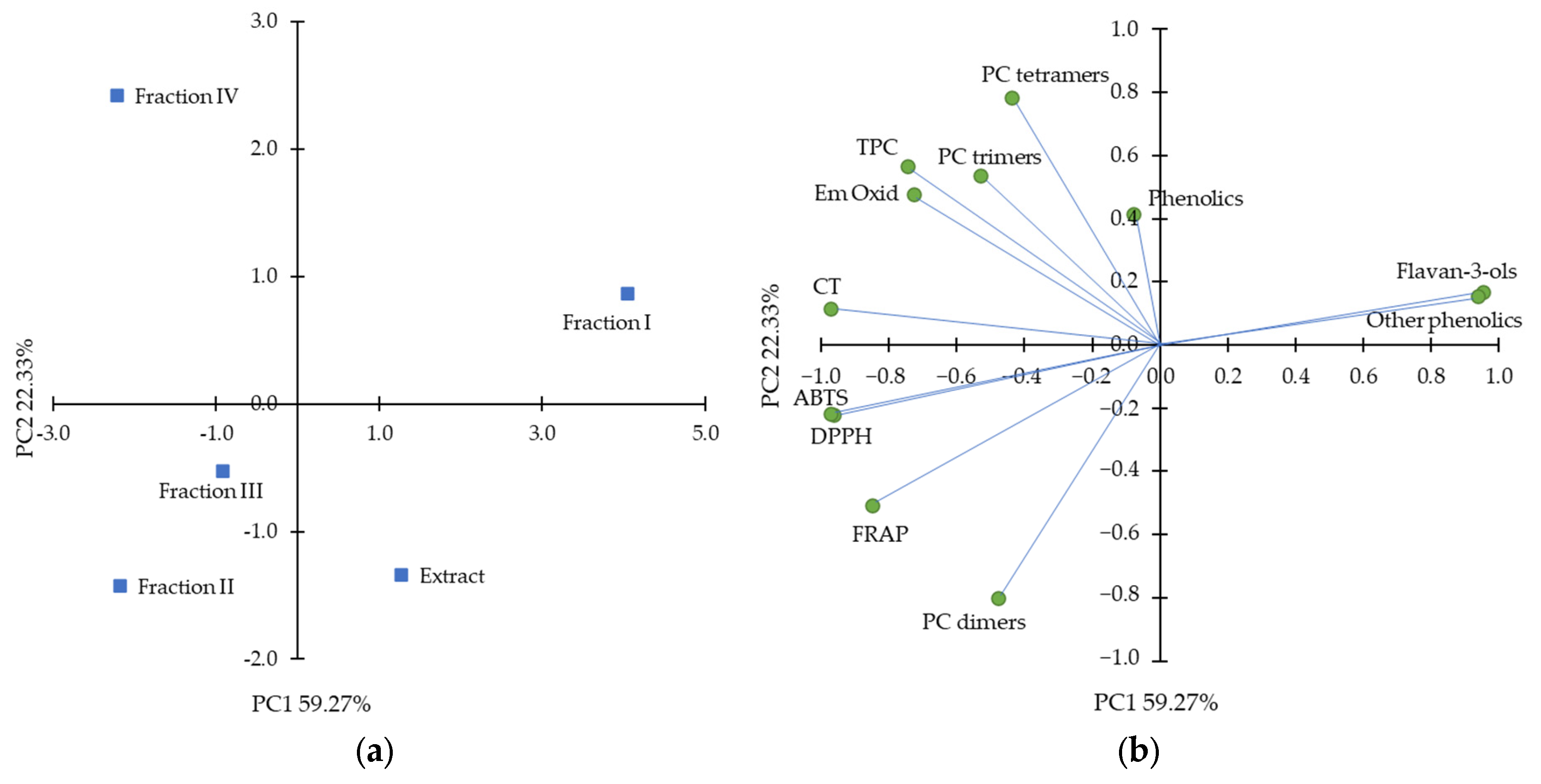 Principal component analysis plots with (a) distribution of objects and (b) distribution of the variables, including total phenolic content (TCA), condensed tannin (CT) content, ferric-reducing antioxidant power (FRAP), ABTS•+ scavenging activity (ABTS), DPPH• scavenging activity (DPPH), inhibition of β-carotene-linoleic acid emulsion oxidation after 180 min (Em Oxid) and sum of different class of phenolics from high-performance liquid chromatography analysis.