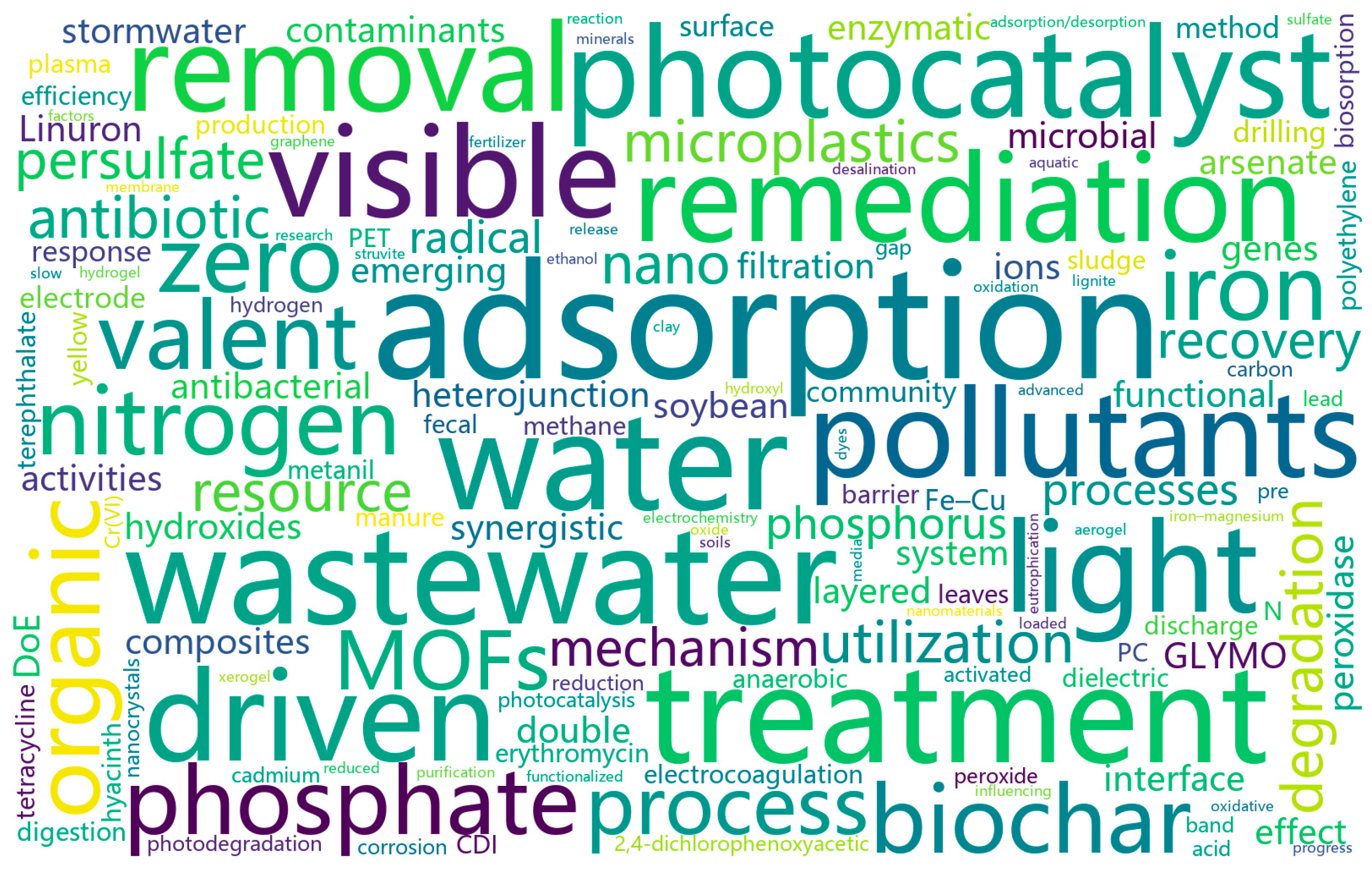 From the perspective of wastewater treatment processes, in addition to the adsorption, advanced oxidation, and reduction processes emphasized in Volume I, Volume II has also attracted studies on biocatalysis, dielectric barrier discharge plasma degradation, capacitive deionization, and separation by pervaporation membranes. From the perspective of materials, this Special Issue’s representative systems include metal oxides, bio-based materials, carbon materials, and two-dimensional materials. From the perspective of treatment targets, beyond conventional contaminants, many articles focus on resource recovery from eutrophication-related pollutants, as well as numerous emerging organic pollutants, such as diclofenac and aceclofenac. To facilitate readers’ understanding of the research included in this issue, as in Volume I, I have prepared a keyword word cloud (Figure 1).