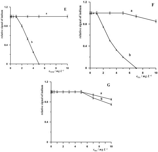 Relative signal of indium in the presence interferents: CTAB (A), Triton X-100 (B), SDS (C); Rhamnolipid (D), NOM (E), FA (F) and HA (G) for AdSV (curves a) and ASV (curves b) measurement. Concentration of In(III) 5 × 10−8 mol L−1. AdSV measurement conditions: activation potential and time −2.5 V and 45 s, accumulation potential and time −0.65 V and 10 s. ASV measurement conditions: activation potential and time −2.4 V and 20 s, accumulation potential and time −1.2 V and 20 s.