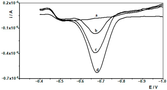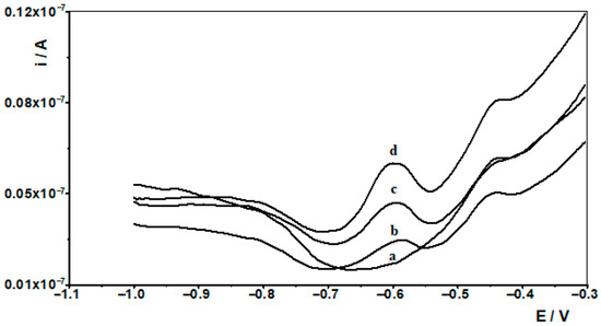 Differential pulse voltammograms obtained in the course of the In(III) AdSV technique determination in Baltic sea. Baltic sea diluted ten times: (a). Baltic sea spiked with 1 × 10−7 mol L−1 In(III): (b) diluted ten times; (c) as (b) + 1 × 10−8 mol L−1 In(III); (d) as (b) + 2 × 10−8 mol L−1 In(III).