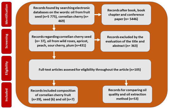 The literature was searched using the following databases: ScienceDirect, Elsevier, SciFinder, PubMed, Web of Science, and Google Scholar, with keywords such as seed/kernel oil, cornelian cherry (Cornus mas L.), and fruit seed oil (Figure 1). Cornelian cherry oil was also compared with the oils of commonly cultivated stone fruits, including apricot, peach, cherry, and plum, and with rosehip seed oil, known for its applications in the cosmetics industry. To emphasize the potential health-promoting properties of cornelian cherry oil, we compared it with palm oil, palm kernel oil, soybean oil, rapeseed oil, sunflower oil, cottonseed oil, peanut oil, olive oil, and hemp oil. The search was primarily limited to articles published in English, and the literature review covered publications from 2000 to 2025. The search process began in May 2025 and was last updated on 28 October 2025.