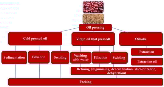 A third approach, multi-stage refining, is used to improve quality and stability of mechanically or solvent-extracted oils [49]. In this process, residual oil in the press cake is extracted using solvents such as hexane or extraction naphtha, followed by a sequence of refining steps: degumming, neutralization, beaching, and deodorization. These treatments effectively remove free fatty acids, phospholipids, pigments, and volatile odor compounds, producing oil with enhanced oxidative stability and desirable sensory attributes. [50,51]. However, it should be noted that solvent extraction may co-extract undesirable components (e.g., pesticide residues or trace metals), which must be eliminated during refining to ensure safety and compliance with food-grade standards.