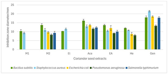 Antibacterial activity of coriander seed extracts [methanol (M1, M2), ethanol (Et), acetone (Ace), ethyl acetate (EA), and hexane (He)] and gentamicin (Gen) measured as inhibition zone diameter in the agar-well diffusion assay. The M1, M2, Et, Ace, EA, He extracts were tested at 30% (w/v). Data represent means of triplicate analysis ± SD. The graph only includes coriander seed extracts that exhibited inhibition against at least one bacterium.