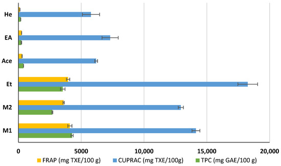 Total phenolic content (TPC) and antioxidant capacity of methanol (M1, M2), ethanol (Et), acetone (Ace), ethyl acetate (EA), and hexane (He) extracts of coriander seeds. Values are mean ± SD (n = 2). FRAP: ferric-reducing antioxidant power; CUPRAC: cupric-reducing antioxidant capacity; GAE: gallic acid equivalents; TXE: Trolox equivalents.