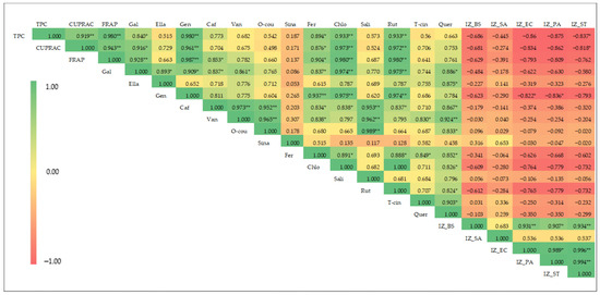 Heat map of Pearson’s correlation coefficient for phenolic content, antioxidant activity, phenolic composition, and antibacterial activity of coriander seed extracts (TPC: total phenolic content; CUPRAC: cupric-reducing antioxidant capacity; FRAP: ferric-reducing antioxidant power; Gal: gallic acid; Ella: ellagic acid; Gen: gentisic acid; Caf: caffeic acid; Van: vanillic acid; O-cou: o-coumaric acid; Sina: sinapinic acid; Fer: ferulic acid; Chlo: chlorogenic acid; Sali: salicylic acid; Rut: rutin; T-cin: trans-cinnamic acid; Quer: quercetin; IZ_BS: inhibition zone of B. subtilis; IZ_SA: inhibition zone diameter of S. aureus; IZ_EC: inhibition zone diameter of E. coli; IZ_PA: inhibition zone diameter of P. aeruginosa; IZ_ST: inhibition zone diameter of S. typhimurium. ** and *: significant at p < 0.01 and p < 0.05, respectively.