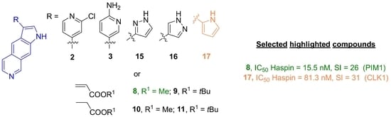 - Zeinyeh, W.; Esvan, Y.J.; Josselin, B.; Defois, M.; Baratte, B.; Knapp, S.; Chaikuad, A.; Anizon, F.; Giraud, F.; Ruchaud, S.; et al. Synthesis and biological evaluation of Haspin inhibitors: Kinase inhibitory potency and cellular activity. Eur. J. Med. Chem. 2022, 236, 114369. [Google Scholar] [CrossRef] [PubMed]