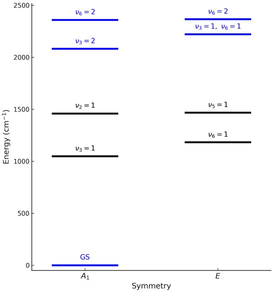 Simplified energy diagram of CH3F rovibrational levels by symmetry (A1 and E). The levels shown in blue (GS, , , ) correspond to the ground state and the target triad, which are the focus of our experimental and theoretical investigation. The other levels are displayed for reference.
