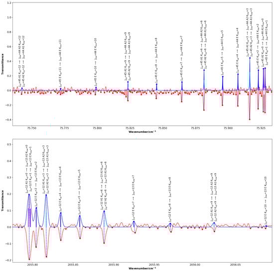 At the beginning of the assignment process, an intensity cut-off of 1 × 10−24 cm/mol was applied consistently. This cut-off enabled SpectraMatcher to automatically identify CH3F lines while eliminating nearly all contributions from noise and was particularly effective in distinguishing the CH3F lines from CO2 lines in the and 2 regions. Next, both automatic and manual assigned CH3F lines were saved for later adjustment of line positions using MIRS via automatic fitting.