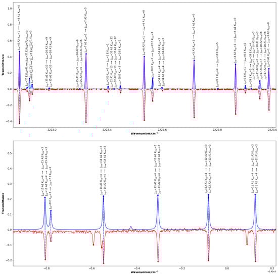 For the 2 band and the ground state, the assignments were more straightforward: the predicted line positions matched very well with observation, and the same cut-off strategy ensured rapid and unambiguous line identification. In the earlier high-resolution study of Faust et al. [], the rotational structure was identified up to with K values up to 12, although most of the doublets remained unresolved under their experimental conditions. By contrast, thanks to the maximum resolution of our Bruker IFS 125HR spectra (0.003 cm−1), we were able to resolve the doublets and to extend the assignments up to and . A total of 1060 lines were included in the fit of the 2 band, with an RMS deviation of 6.74 × 10−4 cm−1. This improvement provided a denser and more accurate set of transitions for the effective Hamiltonian analysis compared with previous studies.