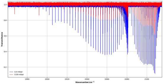 Two absorption spectra were measured at pressures of 1 and 3 mbar using a 2 m horizontal White-type multi-pass cell with an effective path length of 8.264 m. Because of the weak intensity of the band, this long optical path was required. In this case, the CH3F sample was purchased from Sigma Aldrich (purity 97.5%). Strong CO2 lines, present in this spectral region, were used to calibrate the wave number scale against the HITRAN database [], yielding an accuracy of about 2.3 × 10−4 cm−1. Figure 6 shows an overview of the region.