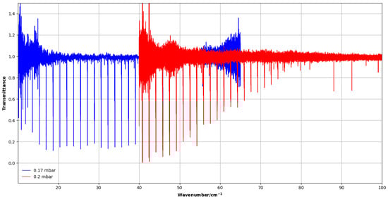 As shown in Table 1, different spectra were selected for the line position analysis. For the band, the spectrum recorded at a pressure of 0.09 mbar was used, while for the 1 mbar spectrum was retained. For , the spectrum recorded at a pressure of 2.56 mbar was selected. For the far-infrared region, all spectra listed in Table 2 were included in the analysis.