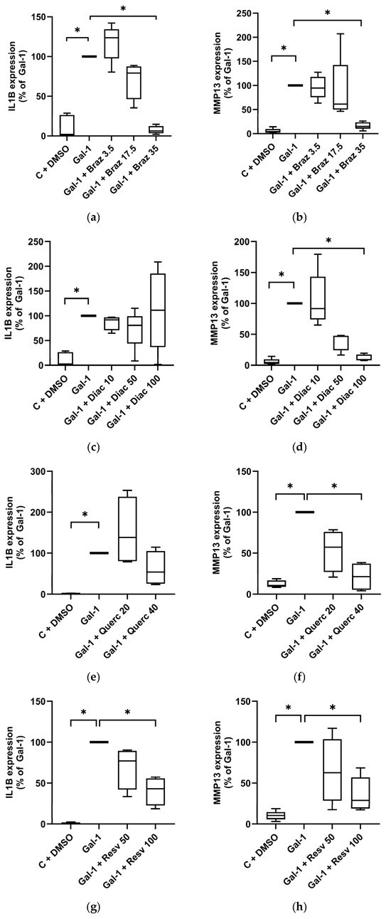 Co-treatment with Brazilin dose-dependently reduced the Gal-1-induced IL1B (Figure 2a) and MMP13 (Figure 2b) expression, with significant suppression to basal levels at 35 µM. Diacerein had no effect on IL1B expression (Figure 2c) but significantly decreased MMP13 levels in a dose-dependent manner, reaching baseline at 100 µM (p < 0.05; Figure 2d). At 40 µM, Quercetin reduced IL1B expression by 46.1% (Figure 2e), though without statistical significance, while MMP-13 was significantly reduced by 78.8% (Figure 2f). Resveratrol (100 µM) significantly suppressed both IL1B (to 43.2%; Figure 2g) and MMP13 (to 28.9%; Figure 2h). ASU had no significant effect on either marker (Figure S1a,b) expression.