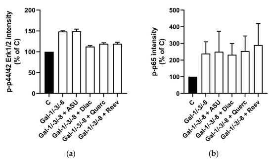 To explore potential molecular mechanisms, we further examined Erk1/2 and NF-κB phosphorylation in the same chondrocyte populations. We stimulated the cells with a combination of Gal-1, -3, and -8, which increased phospho-Erk1/2 by 48.9% and phospho-p65 by 139.5% (Figure 3a,b), confirming our previous findings of NF-κB activation by galectins [17]. Interestingly, co-treatment with Diacerein, Quercetin, or Resveratrol selectively reduced phospho-Erk1/2 levels—by up to 36.2% in the case of Diacerein (Figure 3a)—while phospho-p65 levels remained unchanged (Figure 3b). ASU did not alter the activation of either pathway. Together, these data indicate that, with the exception of ASU, all tested phytochemicals attenuated galectin-induced pro-inflammatory and catabolic responses in OA chondrocytes to varying extents.
