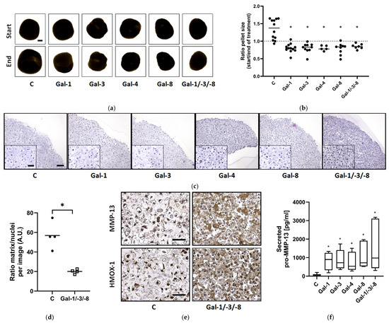 Morphological analysis revealed that all galectin treatments reduced pellet size compared to untreated controls (Figure 4a). Quantitative assessment of the size ratio (end/start) confirmed significant growth inhibition across all treatments (Figure 4b), while untreated controls grew over time, suggesting matrix compaction or tissue shrinkage. In agreement with our previous findings [17], no cytotoxic effects of the galectins were observed. Histological examination showed reduced matrix content and disrupted cellular organization in galectin-treated pellets (Figure 4c and Figure S2). Image J (1.54g v20)-based quantification demonstrated a significant reduction in the matrix-to-nuclei ratio particularly with Gal-1/-3/-8 treatment, which significantly decreased the matrix density by 35.3% (Figure 4d). Immunohistochemistry revealed elevated protein levels of MMP-13, HMOX-1, and ADAMTS-4 after Gal-1/-3/-8 treatment (Figure 4e and Figure S3a). Control pellets exhibited weak basal cytosolic staining for MMP-13, HMOX-1, and ADAMTS-4. Following treatment with Gal-1/-3/-8 a marked increase in cytosolic staining was observed, accompanied by strong extracellular matrix staining for MMP-13 and ADAMTS-4. ELISA confirmed elevated secretion of pro-MMP-13 in response to all galectins, with the strongest effect observed for Gal-1/-3/-8 (Figure 4f).