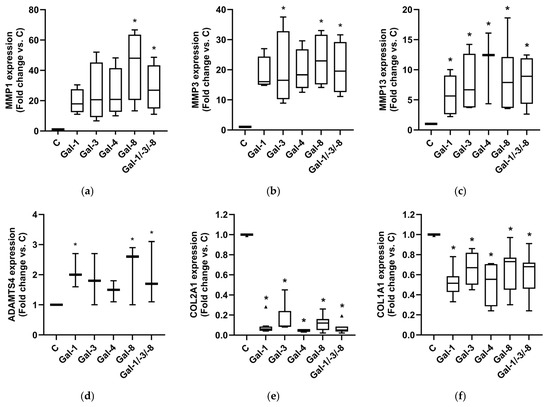 RT-qPCR analysis revealed strong upregulation of MMP-1 (Figure 5a), MMP-3 (Figure 5b), MMP-13 (Figure 5c), and ADAMTS-4 (Figure 5d) across all galectin treatments despite the inherent donor-dependent variability. Gal-8 and the Gal-1/-3/-8 combination consistently induced the highest expression. In parallel, the matrix-associated genes COL2A1 (Figure 5e) and COL1A1 (Figure 5f) were significantly downregulated in all galectin-treated pellets. Together, these findings indicate that individual galectins can modulate pathobiological processes in OA related to extracellular matrix remodeling. Notably, the combination of Gal-1, -3, and -8, applied at lower concentrations than the individual galectins, induced a similarly strong catabolic, matrix-degrading, and potentially pro-inflammatory phenotype in OA cartilage models. This finding suggests an additive effect of the individual galectins.