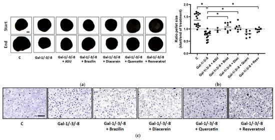 Avocado Soybean Unsaponifiables (ASU) from Laboratoires Expanscience (Paris La Défense, France) was applied with 20 or 40 µg/mL, Brazilin (Braz) a kind gift from [28] with 3.5, 17.5, or 35 µM, purity ≥ 95% (HPLC); Diacerein (Diac 50 or 100 µM; Sigma-Aldrich (St. Louis, MO, USA), D9302, purity ≥ 95% (HPLC)), Quercetin (Querc 20 or 40 µM; Biosynth (Staad, Switzerland), FQ32160, >97% (HPLC)), and Resveratrol (Resv 50 or 100 µM; Sigma-Aldrich, R5010, trans-isomer, purity ≥ 99% (HPLC)). ASU was dissolved in ethanol, while Brazilin, Diacerein, Quercetin, and Resveratrol, were solubilized in dimethyl sulfoxide (DMSO). Concentrations were selected based on published data [11,15,22,29,30]. All substances were applied to serum-starved OA chondrocyte cultures solely or in the presence of Gal-1 (10 µg/mL) in 2D experiments or Gal-1/-3/-8 (5/1/5 µg/mL) in 2D and 3D experiments.
