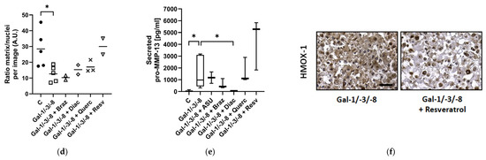 Impact of galectins on human OA cartilage-like tissues in size. OA pellets were formed within three weeks followed by two weeks of treatment with either Gal-1 (10 µg/mL), Gal-3 (18 µg/mL), Gal-4 (24 µg/mL), Gal-8 (24 µg/mL) or the mixture of Gal-1/-3/-8 (5/1/5 µg/mL). (a) Representative images of OA pellets from one donor at the timepoints of starting and ending the galectin treatment. Start image of control displays scale bar (500 µm). (b) Scatter dot plot shows the ratio of pellet sizes between the start and end after two weeks of galectin treatment. Statistical analysis was performed using Kruskal–Wallis Test with pairwise comparison. The lines indicate the medians. The dashed line represents the ratio of 1, indicating a hypothetical, stable pellet size during treatment. (c) Histological staining of OA pellets after two weeks of treatment, using hematoxylin and eosin. Scale bar correlates to 100 µm. (d) Scatter dot plot shows ratio of matrix to nuclei per image, quantified by using Image J. Each datapoint is composed of the mean of three analyzed images of controls and galectin treatment. The lines indicate the mean. For statistical analysis a t-test with related samples was performed (n = 4). (e) Sections of controls and galectin-treated OA pellets were stained immunohistochemically for MMP-13 and HMOX-1 (scale bar = 100 µm). (f) pro-MMP-13 secretion into the supernatant was measured by ELISA and shown as a box plot with Tukey whiskers. Asterisks show significant p-values (* p < 0.05).