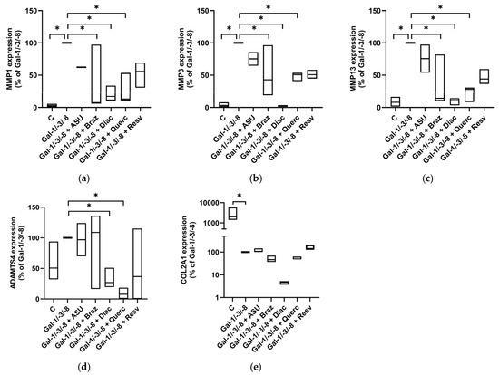 Impact of phytochemicals on OA marker expression of OA pellets. Relative mRNA expression levels in percent (Gal-1/-3/-8 was set to 100%) shown as floating bar plots (line at median) for MMP1 (a), MMP3 (b), MMP13 (c), ADAMTS4 (d), and COL2A1 (e). Statistical significance was determined by Kruskal–Wallis test with pairwise comparisons. Asterisks indicate statistically significant differences (* p < 0.05).