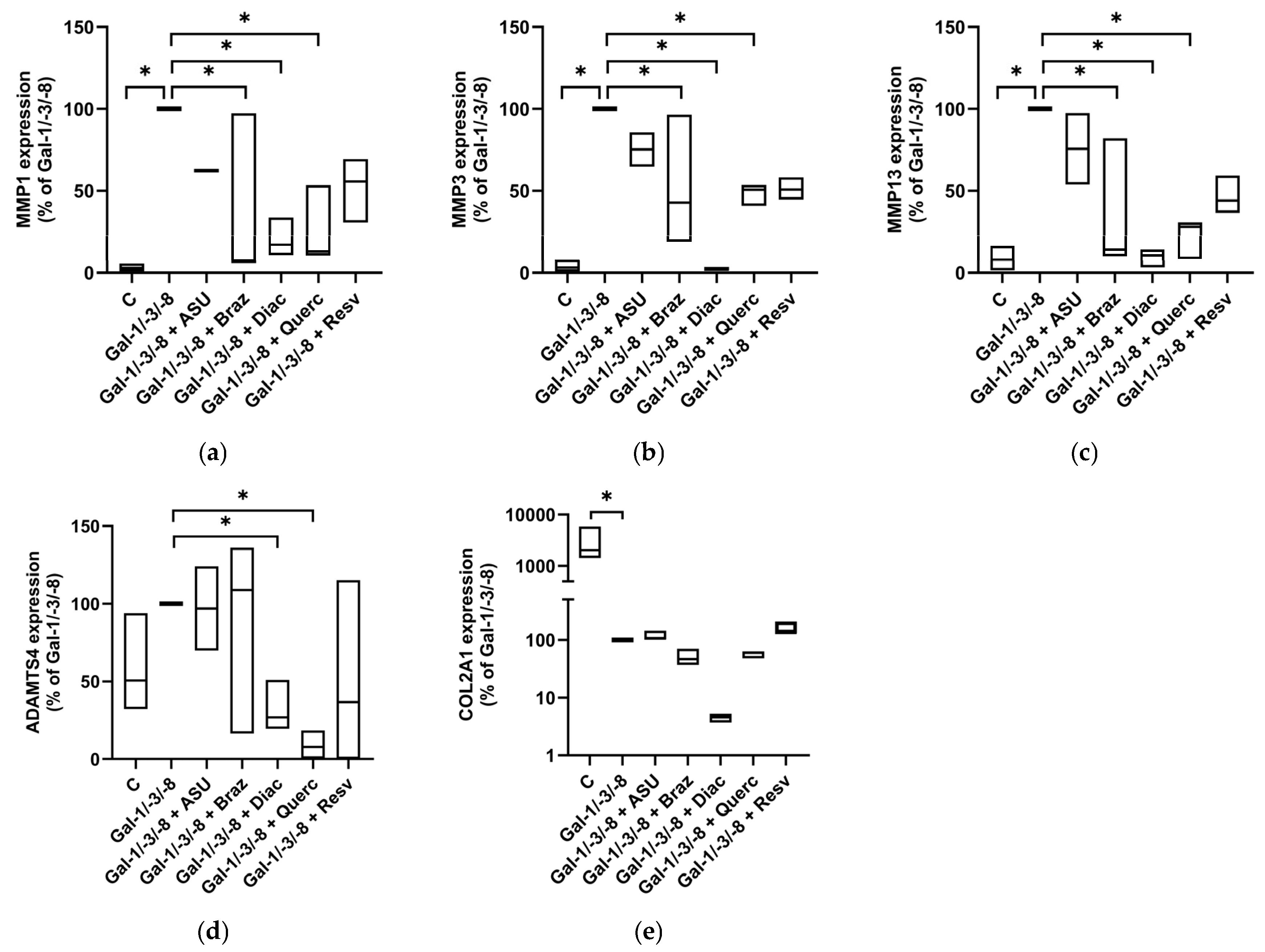 2.1. Phytochemicals Attenuate Galectin-Induced Upregulation of IL1B and MMP13 in Primary OA Chondrocytes
