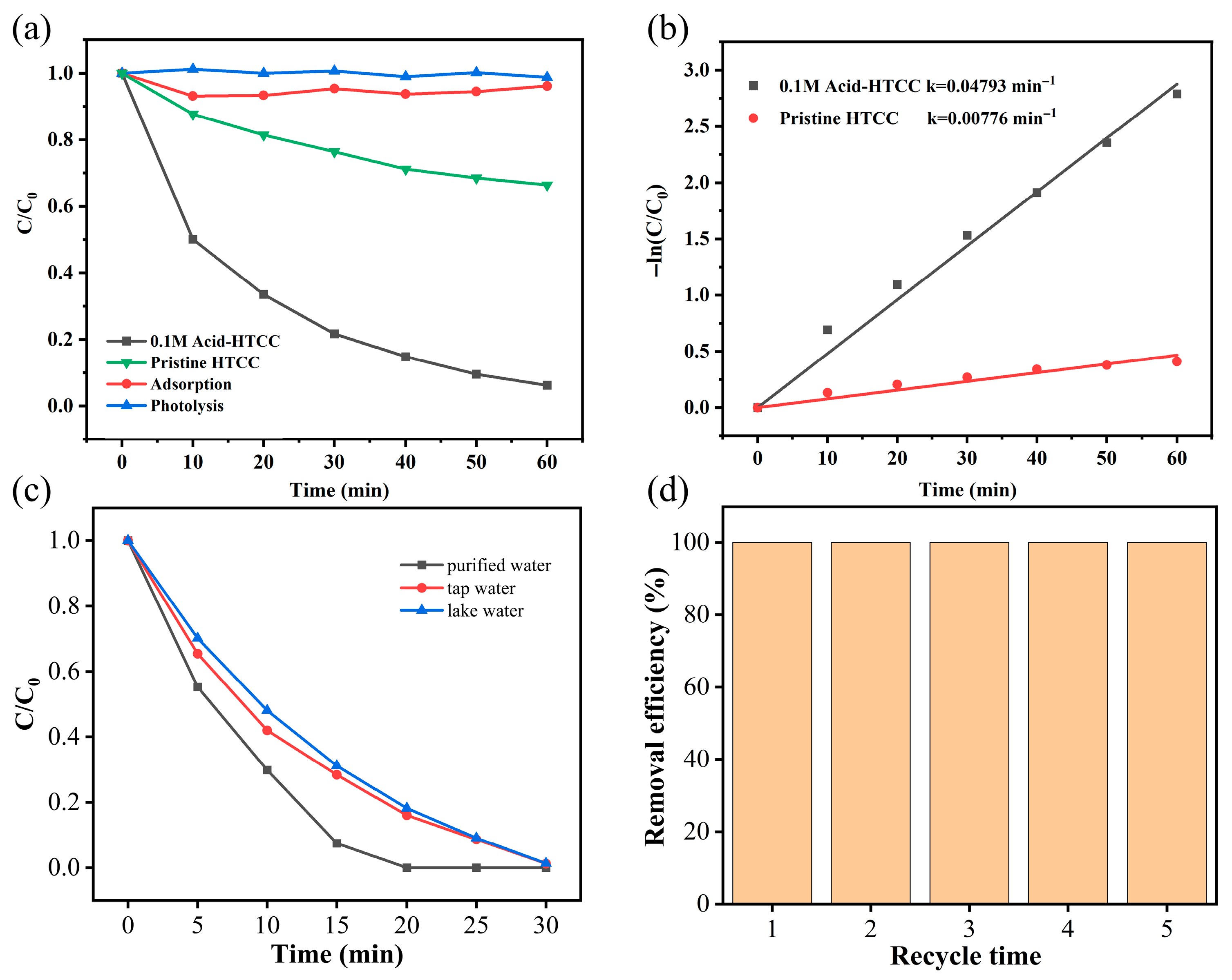 - Xu, H.; Li, M.; Ou, Y.; Li, S.; Zheng, X.; Li, X.; Tang, C.; Chen, D. The reconstitution of reed cellulose by the hydrothermal carbonization and acid etching to improve the performance of photocatalytic degradation of antibiotics. Int. J. Biol. Macromol. 2023, 236, 123976. [Google Scholar] [CrossRef] [PubMed]