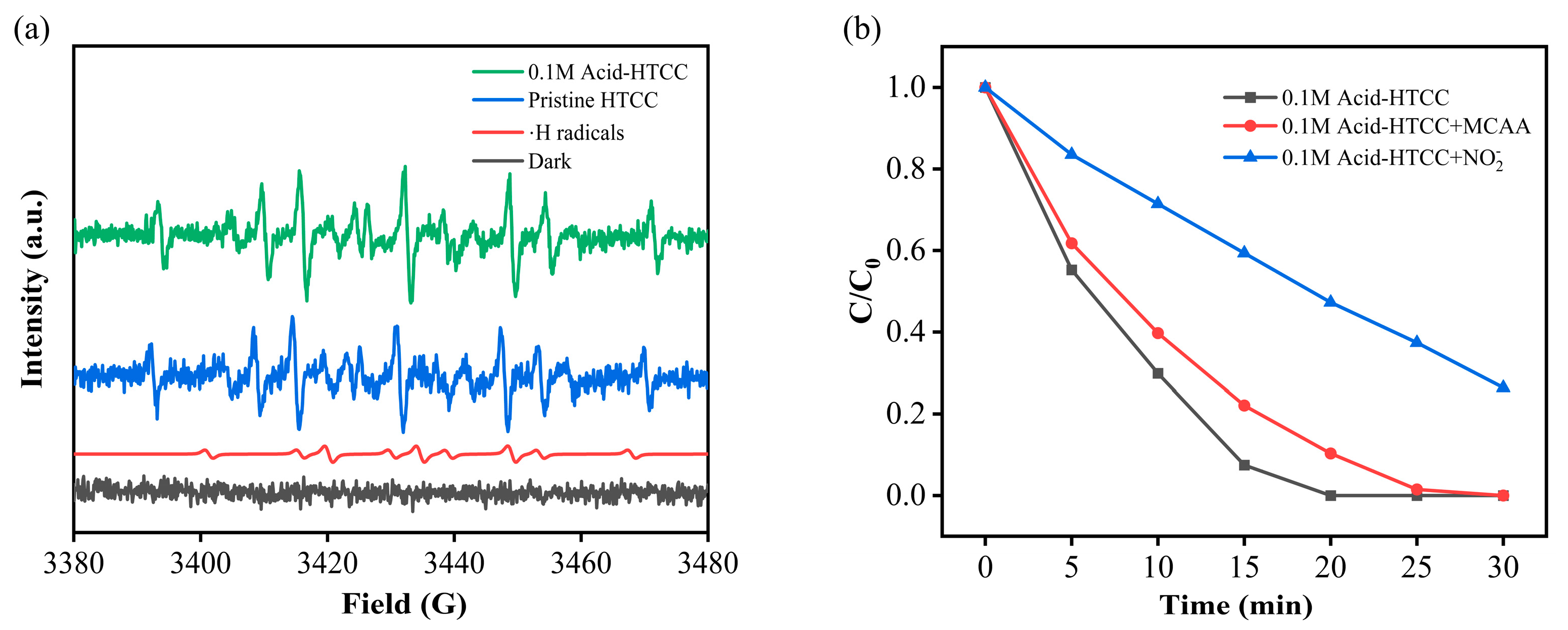 - Wang, Y.; Zhang, Q.; Wang, G.; Wang, X.; Zhang, X.; Dong, X. Hydrothermal carbonization carbon derived from crop straw for efficient photocatalytic elimination of antibiotics: Promotion role of native trace metals on photocatalytic performance. J. Environ. Chem. Eng. 2024, 12, 111959. [Google Scholar] [CrossRef]