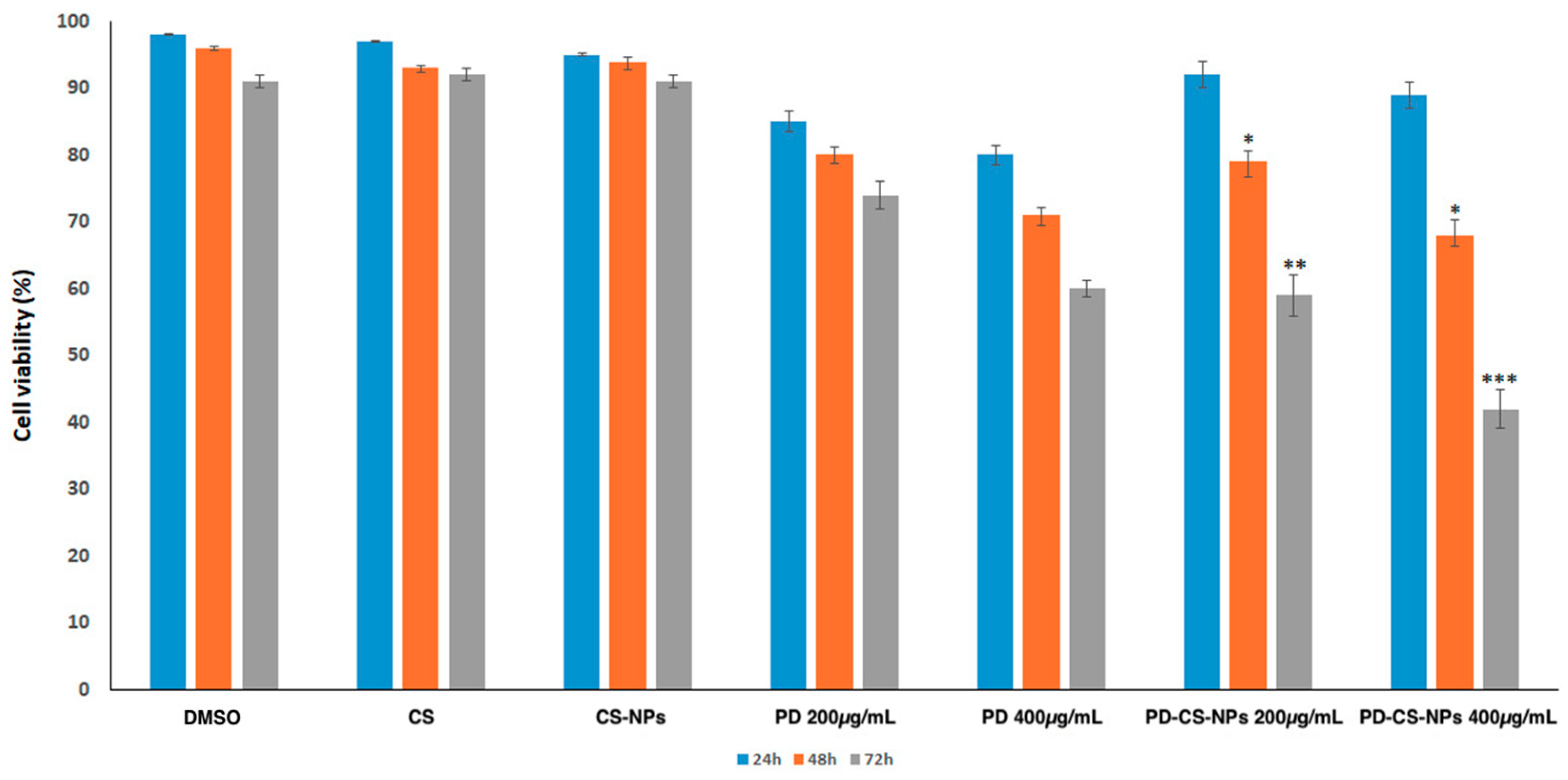 | PD-CS-NPs | 68 ± 5 | 0.44 ± 0.08 | 5 ± 2 | 83 |
