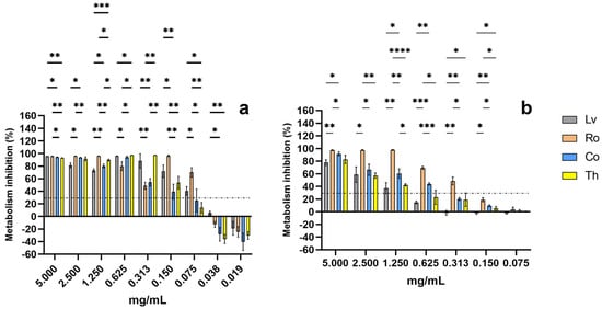 Impact of aromatic plants extracts upon Hela (a) and Vero (b) cellular metabolism. Dotted line represents the 30% cytotoxicity limit as defined in the ISO 10993-5: 2009 []. Data are presented as mean ± SD (n = 4). * Represents a 95% statistical significance (p < 0.05), ** represents 99% statistical significance (p < 0.01), *** represents 99.9% statistical significance (p < 0.001) and **** represents 99.99% statistical significance (p < 0.0001).