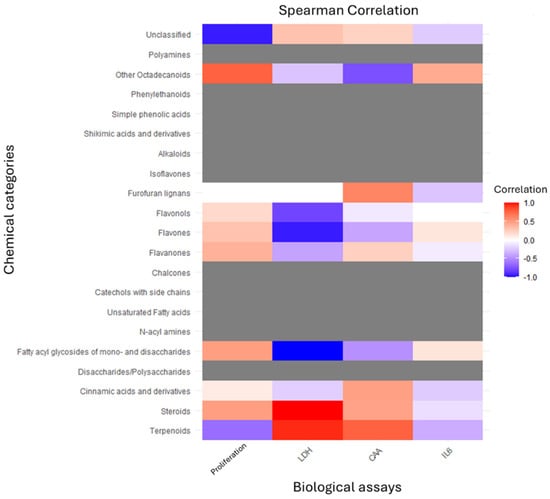 Spearman correlation heat map between chemical classes and biological responses. The heat map depicts the correlation coefficients (ranging from −1 to +1) between the relative abundance of chemical classes identified by LC–MS and the measured biological parameters: cell proliferation, lactate dehydrogenase (LDH) release, cellular antioxidant activity (CAA), and interleukin-6 (IL6) levels. Positive correlations (red) indicate a direct relationship, whereas negative correlations (blue) denote inverse associations.