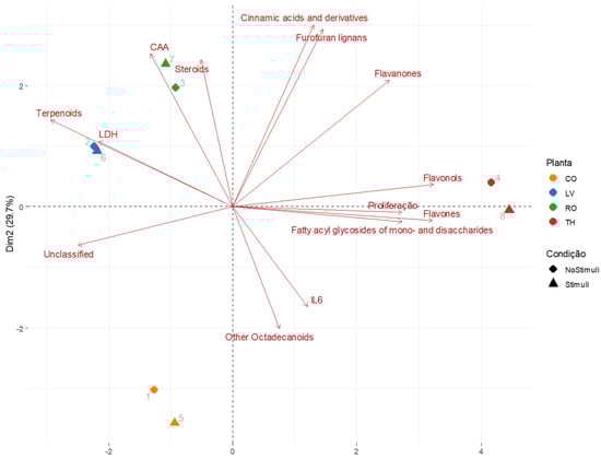 Principal component analysis (PCA) biplot integrating chemical classes and biological responses across four plant species. The PCA illustrates the distribution of costmary (orange), lemon verbena (blue), rosemary (green), and thyme (red) according to their metabolite composition and associated biological responses. Red vectors represent chemical classes, while black arrows indicate biological variables (cell proliferation, LDH, CAA, and IL6).