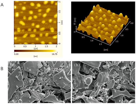 Morphological characterization of FAP-W. (A) Atomic force microscopy analysis; (B) SEM images at 1000× magnification (a) and 2000× magnification (b).