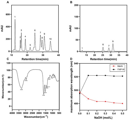 Characterization of FAP-W: physicochemical, monosaccharide, and spectral analyses. (A) FT-IR spectrum; (B) Congo Red Test; (C) HPLC chromatogram of monosaccharide standard, 1. mannose; 2. ribose; 3. rhamnose; 4. glucuronic acid; 5. galacturonic acid; 6. glucose; 7. galactose; 8. xylose; 9. arabinose; 10. fucose; (D) HPLC chromatogram, 1. mannose; 6. glucose; 7. galactose; 9. arabinose.