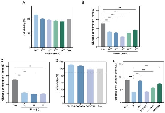 Effects of FAP-W on cell viability and glucose consumption in insulin-induced HepG2 cell model. (A) The effect of various concentrations of insulin on cell viability; (B) changes in glucose consumption of HepG2 cells under the influence of different insulin concentrations (compared with Control group, *** p < 0.001); (C) changes in glucose consumption in HepG2 cells under the influence of different action time (compared with Control group, *** p < 0.001); (D) the effect of different doses of FAP-W on cell viability (In the figure, the dashed line indicates a survival rate of 90%.); (E) the effect of FAP-W on glucose consumption of insulin-induced HepG2 cell model (Compared with Control group, *** p < 0.001; compared with IR group, ### p < 0.001).