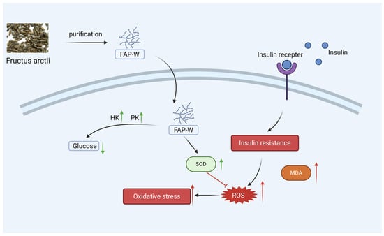 Mechanism of FAP-W in alleviating insulin resistance. Prolonged exposure to insulin results in reduced sensitivity of insulin receptors and glucose accumulation, which consequently elevates the levels of reactive oxygen species (ROS) and triggers oxidative stress. Nevertheless, FAP-W enhances superoxide dismutase (SOD) activity, decreases ROS levels, and mitigates oxidative stress. Furthermore, FAP-W increases the activities of hexokinase (HK) and pyruvate kinase (PK), thereby promoting the glycolytic pathway and exhibiting hypoglycemic activity. In the figure, red arrows indicate damage, and green arrows indicate protection. Created with Biorender.