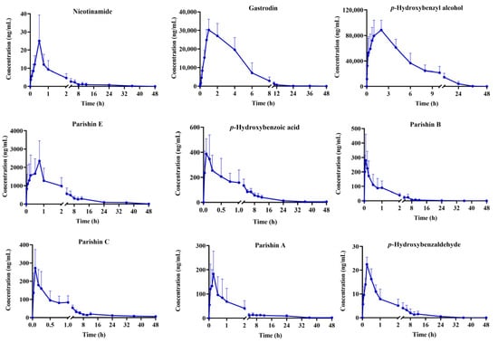 Following gavage of GR extract in rats, the plasma concentrations of six compounds, including adenosine, 3,4-dihydroxybenzaldehyde, syringaldehyde, dauricine, and nobiletin, remained below the LLOQ at the majority of time points. Average plasma concentration-time curves for the remaining analytes, which include phenols (p-hydroxybenzyl alcohol, p-hydroxybenzoic acid), small-molecule phenolic glycosides (gastrodin), citrate esters (parishin A, parishin B, parishin C, parishin E), phenylpropanoids (p-hydroxybenzaldehyde), and vitamins (nicotinamide), are presented in Figure 2.