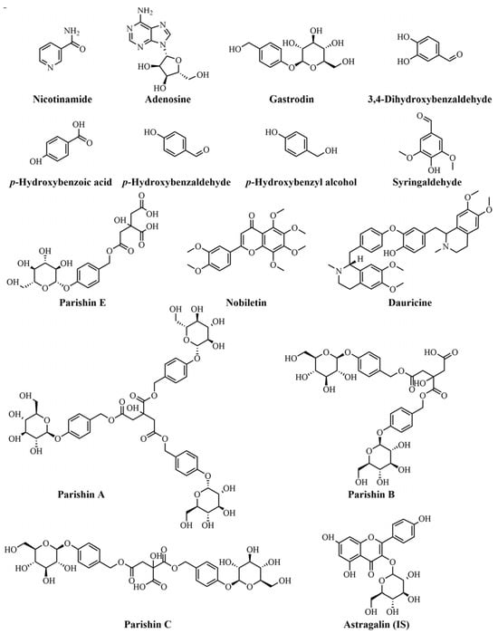 Standards of parishin A, parishin B, parishin C, parishin E, p-hydroxybenzyl alcohol, p-hydroxybenzoic acid, p-hydroxybenzaldehyde, nobiletin, nicotinamide, adenosine, 3,4-dihydroxybenzaldehyde, syringaldehyde, dauricine, and astragalin (internal standard, IS) (purity ≥ 98%) were purchased from Chengdu Desite Bio-Technology Co., Ltd. (Chengdu, Sichuan, China). Gastrodin (purity ≥ 98%) was obtained from Shanghai Yuanye Biotechnology Co., Ltd. (Shanghai, China). Their chemical structures are shown in Figure 3. Ammonium acetate, chromatographic-grade methanol, and acetonitrile were obtained from Fisher Scientific (Fair Lawn, NJ, USA). Chromatographic-grade formic acid was provided by ROE (St Louis, MO, USA). Demineralized water was prepared using a Milli-Q water purification system (Millipore, Milford, MA, USA).