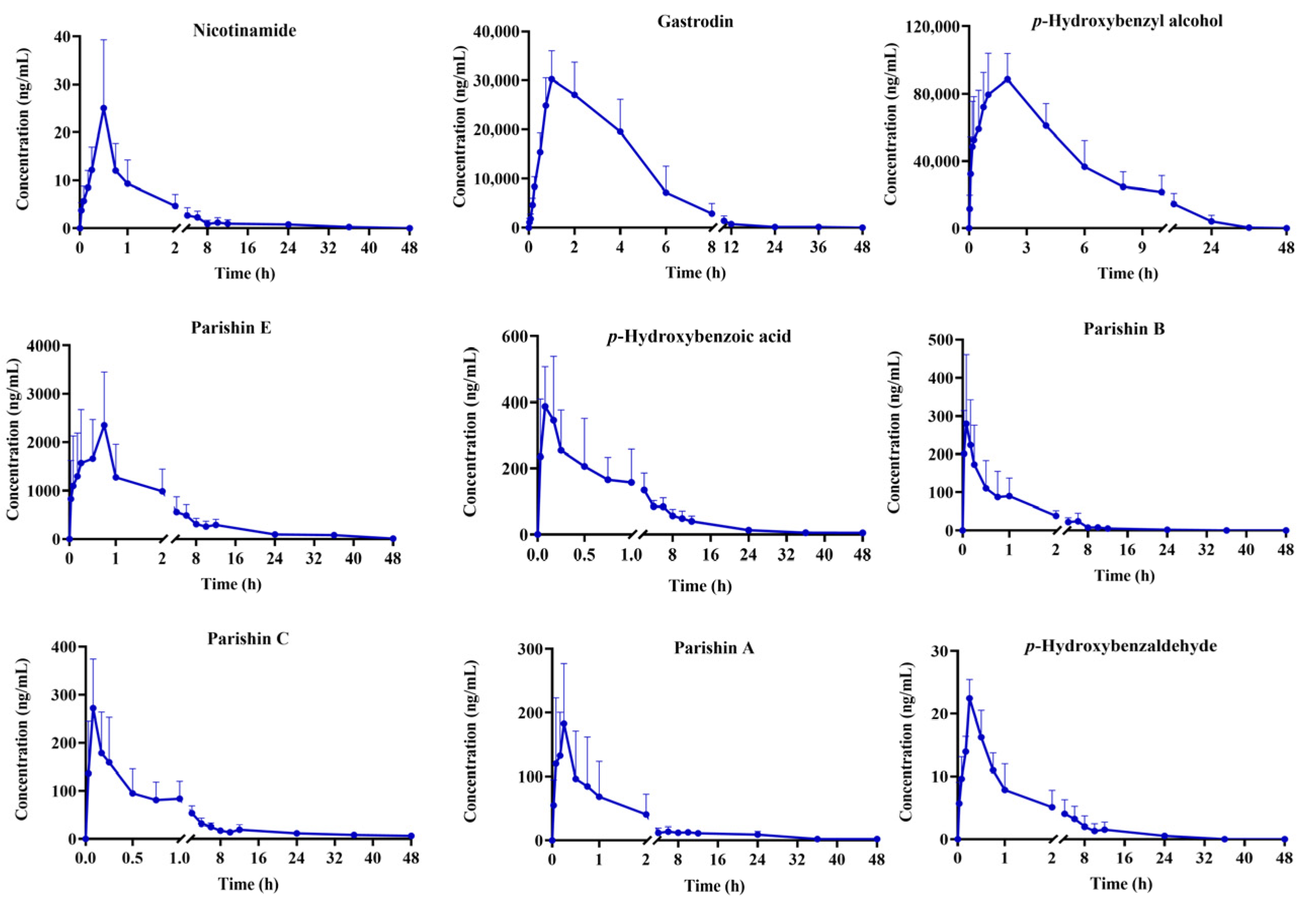 | Gastrodin | 1.50 ± 0.55 | 31,520.17 ± 5396.74 | 8.30 ± 1.14 | 142,755.82 ± 32,418.21 | 144,768.73 ± 31,976.62 |