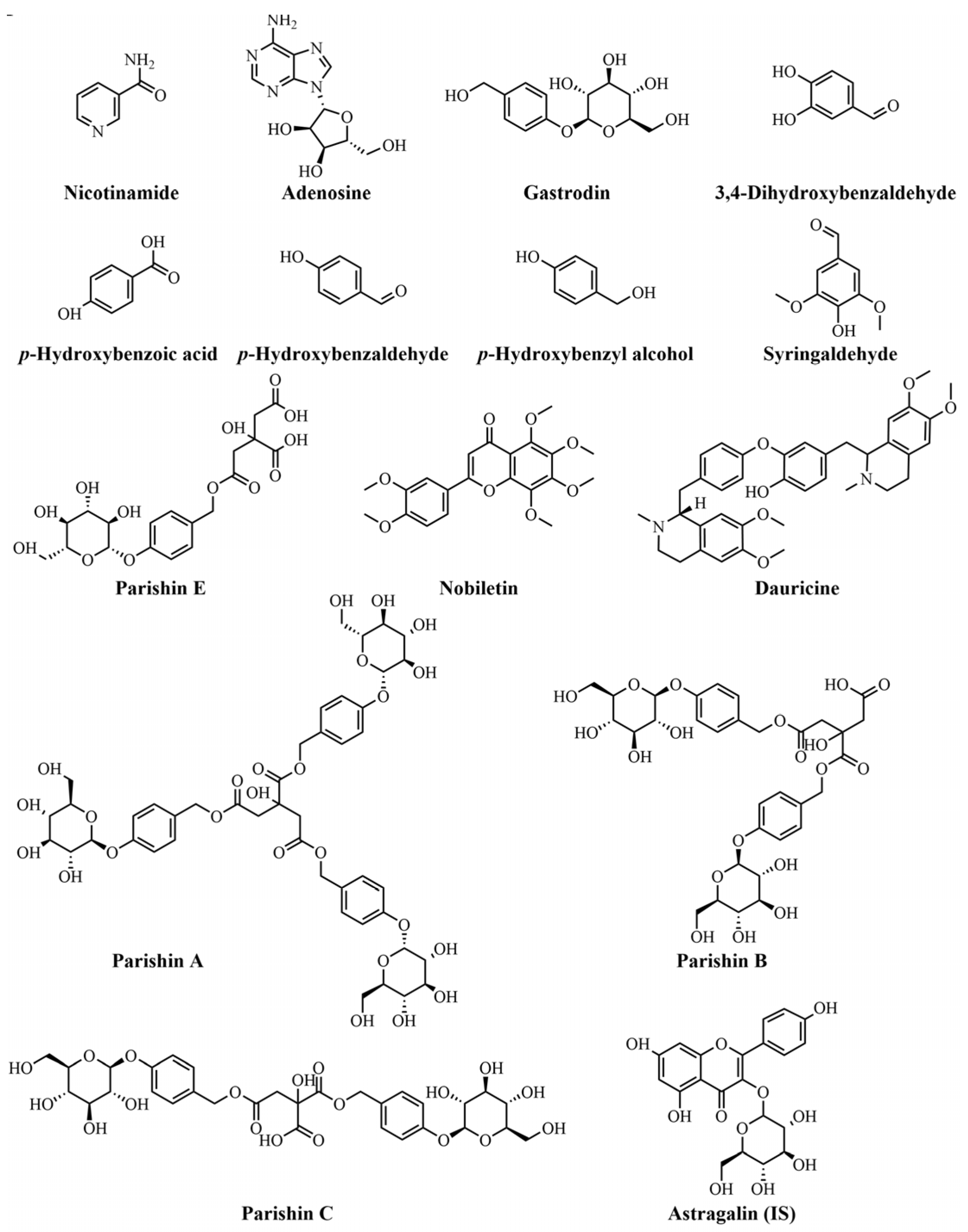 - Wu, J.; Wu, B.; Tang, C.; Zhao, J. Analytical Techniques and Pharmacokinetics of Gastrodia Elata Blume and Its Constituents. Molecules 2017, 22, 1137. [Google Scholar] [CrossRef]
