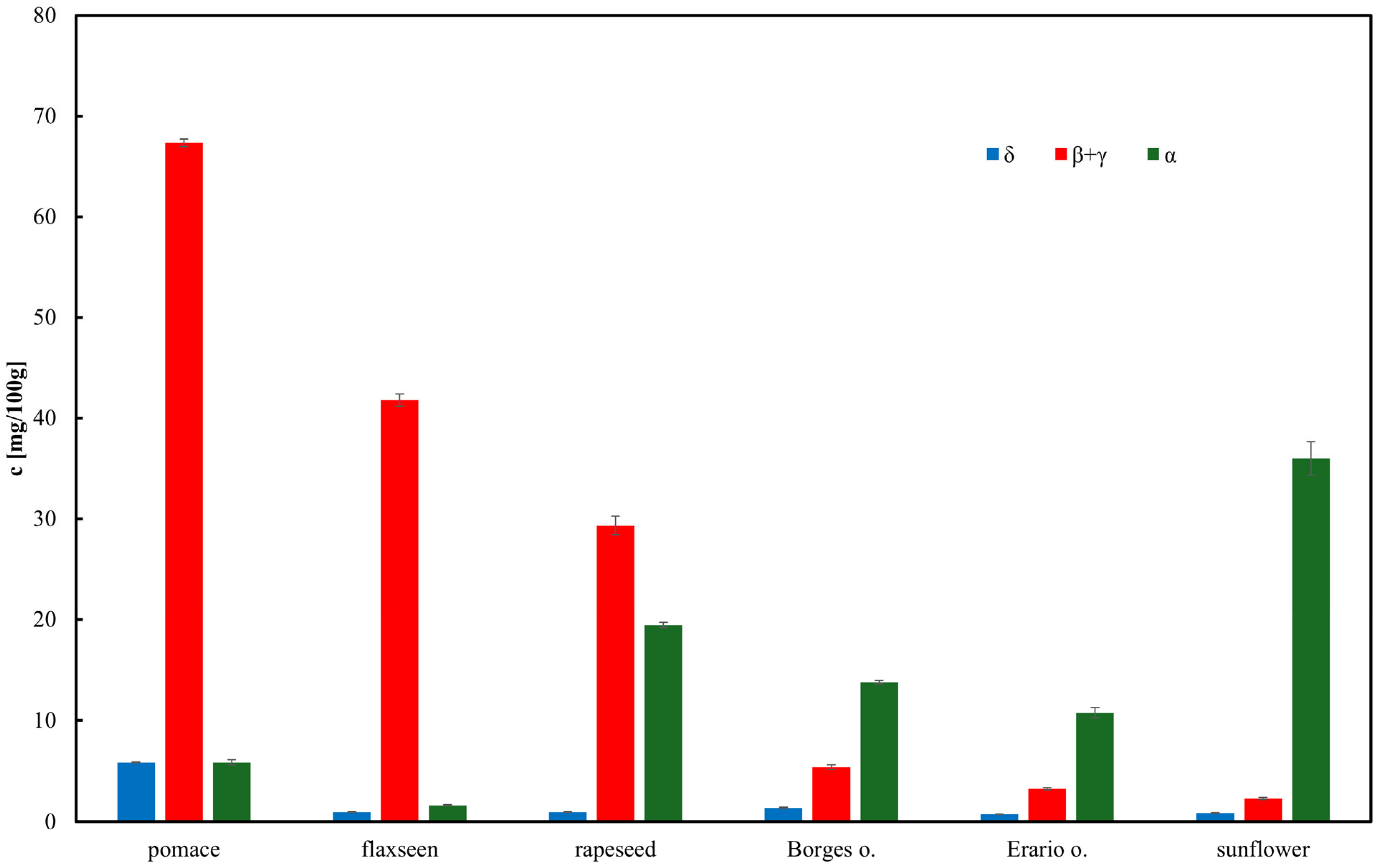 Therefore, the aim of this study was to comprehensively evaluate the tocopherol content and antioxidant potential of rapeseed pomace in comparison with selected edible oils, using a multi-method approach that combines chromatographic (HPLC–ED), spectrophotometric (DPPH and Folin–Ciocalteu), and electrochemical (CV and DPV) techniques.