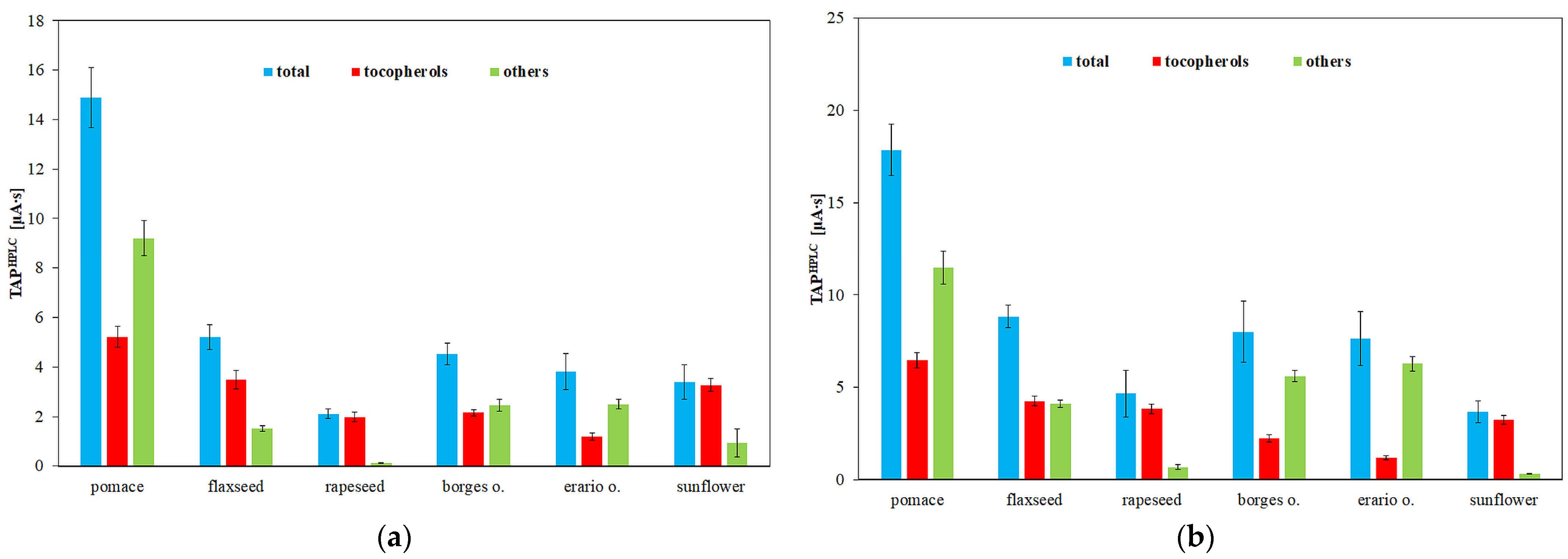 Antioxidants can be detected electrochemically via their oxidation at positive potentials, allowing their quantification using an electrochemical detector following chromatographic separation. An alternative TAP assay based on measuring the total area of all chromatographic peaks recorded by the amperometric detector (TAPHPLC) was proposed [42]. In this study, measurements were performed at two different working electrode potentials (Figure 5). At the lower potential (0.6 V), only strong antioxidants are detected, whereas at the higher potential (0.8 V), both strong and weak antioxidants contribute to the signal. The chromatograms recorded at these potentials (Figure 6) reveal that increasing the potential not only elevates the peak heights but also results in the appearance of new peaks corresponding to weaker antioxidants. Rapeseed pomace exhibited the highest TAP value, which aligns with the high tocopherol content shown in Figure 3. Notably, the TAP of rapeseed oil and its pomace is largely attributed to tocopherols. Conversely, the antioxidant potential in flaxseed pomace is influenced more by other compounds such as phytosterols, phospholipids, and phenolic acids (e.g., p-hydroxybenzoic, salicylic, and cinnamic acids) [54]. Flaxseed oil contains a significant amount of weak antioxidants, as evidenced in Figure 5a,b, consistent with previous findings [55]. For olive oils and flaxseed oil, the predominant antioxidants are relatively weak, as indicated by the noticeable increase in TAP values between 0.6 and 0.8 V. The main difference between these oils is their tocopherol content, which is lower in Borges and Erario olive oils, consistent with the HPLC tocopherol analysis shown in Figure 5. Sunflower oil displays TAP values similar to rapeseed oil, where total tocopherol content strongly influences antioxidant properties despite differences in tocopherol forms, consistent with previous findings [47,56].