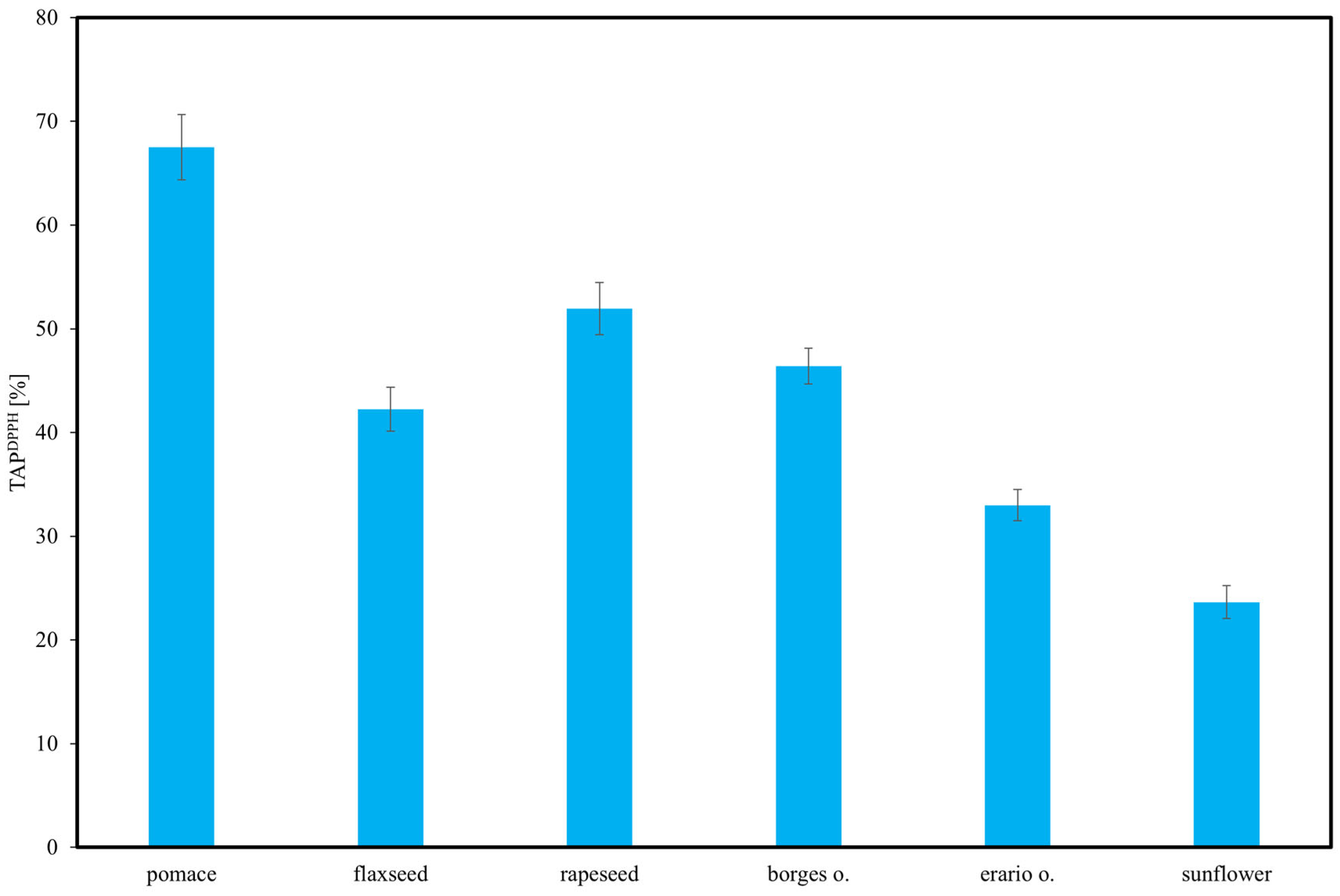 DPPH is a stable free radical that primarily reacts with strong antioxidants [57]. Consistent with the other analytical methods, the highest TAPDPPH values were observed for rapeseed pomace, while sunflower oil exhibited the lowest antioxidant potential.