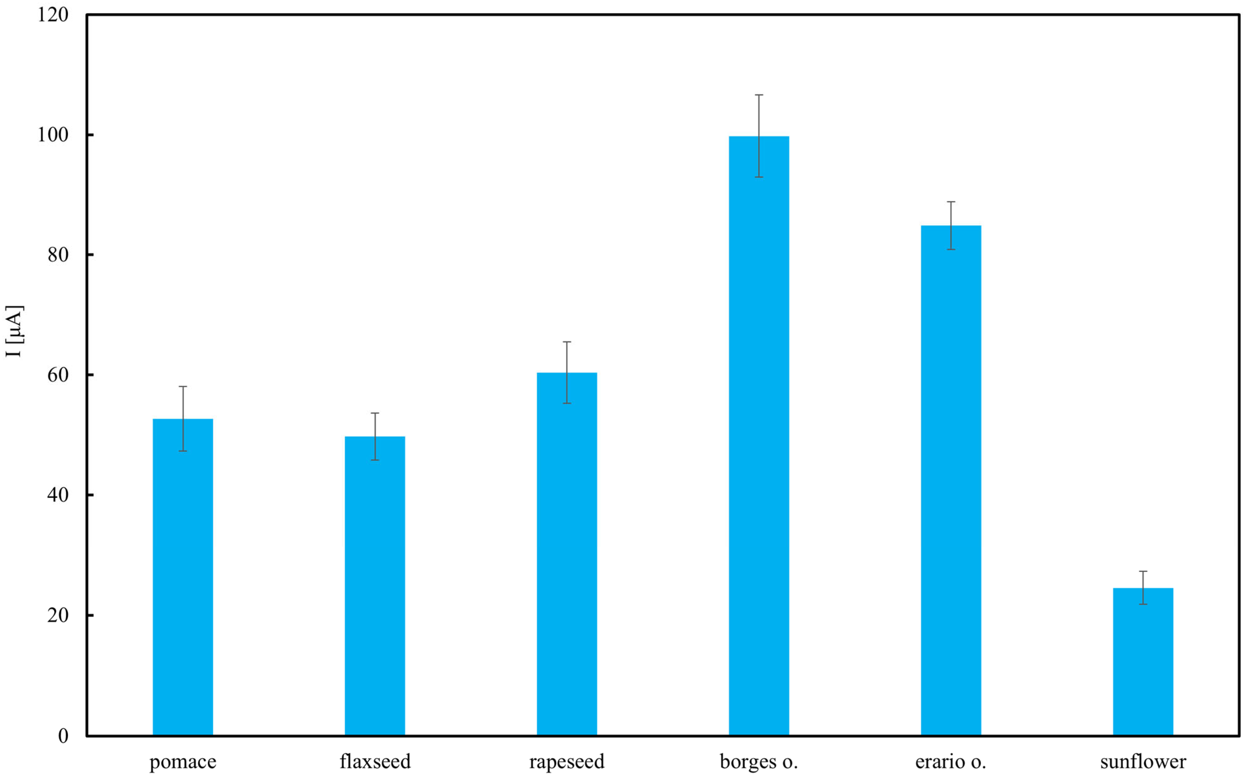 Figure 10 presents TAP of various edible oils, measured electrochemically and expressed as current (I) in microamperes (µA). The results indicate that the highest antioxidant activity was observed in the olive oils—Borges and Erario—with Borges oil reaching approximately 1.5 µA, followed closely by Erario. This is consistent with literature reports highlighting the high polyphenol content in olive oils, compounds well known for their strong antioxidant properties [65,66]. The slight variation between Borges and Erario may be attributed to differences in cultivar, geographic origin, extraction method, or storage conditions. Rapeseed and flaxseed oils showed moderate TAP values, ranging from 0.7 to 0.85 µA. This suggests that, while they contain antioxidant constituents such as tocopherols and omega-3 fatty acids, their polyphenol levels are lower compared to olive oils. These findings are in agreement with results obtained using the Folin–Ciocalteu assay. Interestingly, rapeseed pomace retains a measurable level of antioxidant activity. This suggests that certain antioxidant compounds, though not necessarily electroactive to the same extent as those in olive oils, persist in the pomace. If only one type of analysis was employed, this result could not be recorded. This is the reason why multiple assays should be employed for reliable antioxidant analysis [67]. The effectiveness of electrochemical methods for detecting antioxidants in complex food matrices has been recently demonstrated, confirming their sensitivity and practical applicability [68]. In contrast, sunflower oil exhibited the lowest antioxidant activity (≈0.3 µA). This may be due to the refining process, which tends to reduce the levels of naturally occurring antioxidants. Although sunflower oil contains vitamin E (primarily α-tocopherol), it lacks significant concentrations of polyphenols, contributing to its lower electrochemical antioxidant capacity.