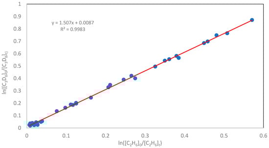 The linear relationship between ln([C3D8]0/[C3D8]ₜ) and ln([C2H6]0/[C2H6]ₜ), determined at 298 K and a total pressure of 100 Torr. The slope of the line, according to Equation (7), is equal to kD/k2.