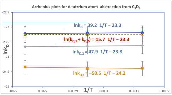 The corresponding Arrhenius relationships for deuterium abstraction from fully deuterated propane (C3D8) are presented in Figure 4.