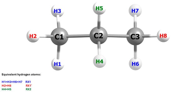 Schematic presentation of the propane molecule with the equivalent hydrogen atoms marked. Due to the molecular symmetry, only three out of eight individual reactions need to be considered to understand the mechanism of the investigated process.
