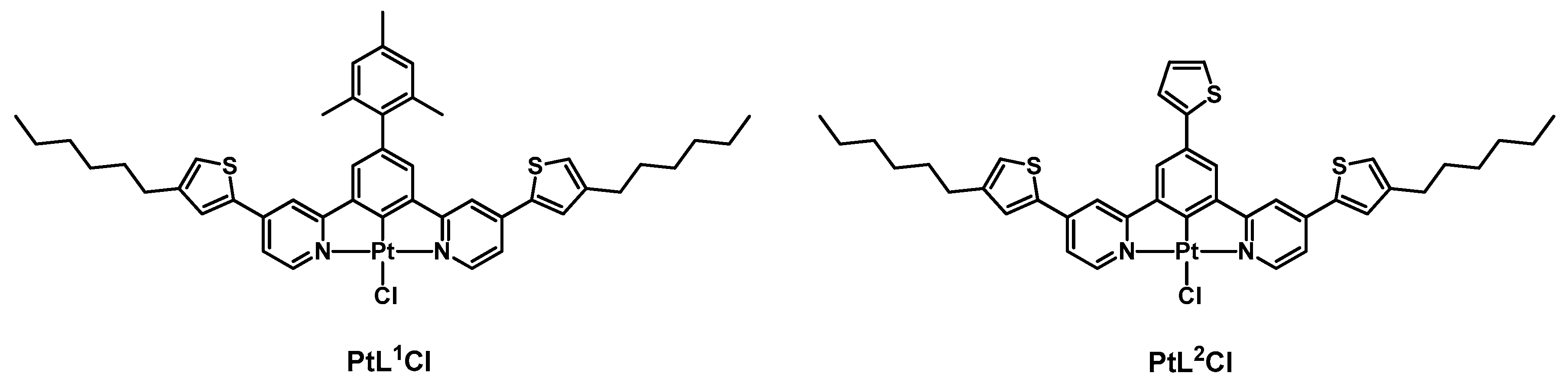 - Roberto, D.; Colombo, A.; Dragonetti, C.; Fagnani, F.; Cocchi, M.; Marinotto, D. Novel class of cyclometalated platinum(II) complexes for solution-processable OLEDs. Molecules 2022, 27, 5171. [Google Scholar] [CrossRef]
